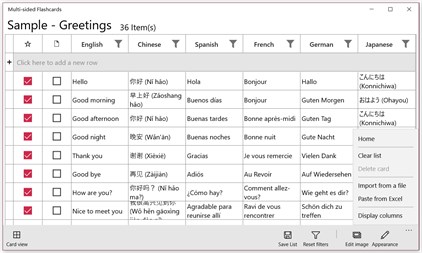 - Up to 6 card items per page - Card view and list view - Support for image file - Support for shuffle play and slideshow - Customizable card color and font size - Import card items by pasting from Excel or loading a text file - Export and import card set - Support for Dark Theme - Support for Hotkeys - Left/Right arrow key: Move to previous/next card - Down arrow key: Open next card item - Number keys (1-6): Toggle (Open/Close) card item