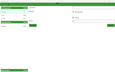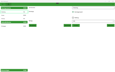 Diese Anwendung erlaubt Benutzern zu behalten ihre Nettowert mit Bildschirmen, mit denen Sie schnell Informationen aktualisieren können. Sie können diese Anwendung zu behalten Ihr Geld wie du es verbrauchst und anzeigen die Geschichte um zu sehen, wie das Konto im Laufe der Zeit verändert hat.