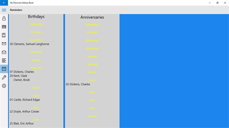 My Personal Address Book is an easy to use address management system. It simplifies keeping track of you addresses, and yet provides many powerful features that allow you to perform functions such as printing various size address books (sized for systems such as Day Timer), printing envelopes addressed to the people in your address book, printing labels address to the people in your address book, and sending e-mails to the people in your address book. In addition, with My Personal Address Book you can get a map and driving directions to the addresses in your address book, and you can display a reminder list of upcoming birthdays and anniversaries.