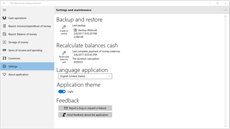 Application intended for quick input of personal financial transactions with money and view balances for each transaction. Implemented accounting functions: 1. Enter cash transactions. 2. Storage of money (bank accounts, cash, place a nest egg, and so on) - unlimitedly. 3. Types of income and expenditure of money - unlimited. 4. Accounting Currency. 5. Types of transactions: cash receipts, cash flow, movement of money between repositories and currency exchange. 6. Report of the money balances at that date in storage and currencies. 7. Statement of income and expenditure of money for a specified period. 8. Backup and recovery.