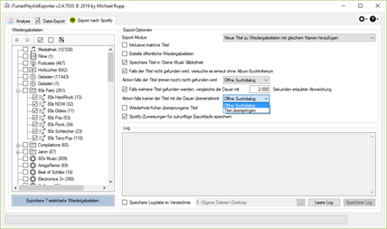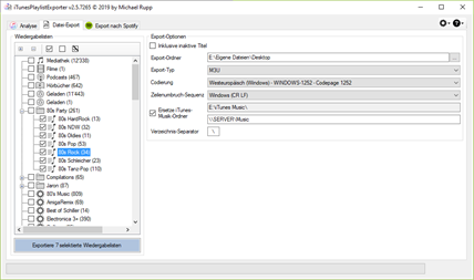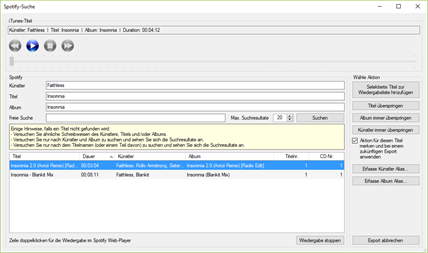 Analysiert deine iTunes-Bibliothek und erlaubt den Export deiner Wiedergabeliste in Textdateien in diverser Formate (CSV, M3U, erweitertes M3U, PLS. WPL und Excel XML) oder - und das ist der Hauptzweck - direkt in dein Spotify-Konto. Falls ein Titel in Spotify nicht automatisch zugewiesen oder gefunden werden kann, kann man die Suche manuell verfeinern. Für beide Arten des Exports gibt es diverse Einstellungsmöglichkeiten.