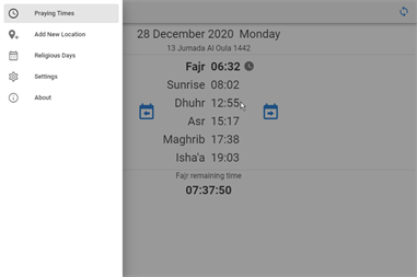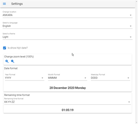 - Multiple themes (Dark or Light) - Change language (currently English and Turkish) - Show or hide Hijri date - Change zoom level - Multiple date formats - Multiple time formats - You can see religious days and nights from the menu item "Religious Days". - In the "Praying Times" screen, when a religious day is close, you will see an alert.
