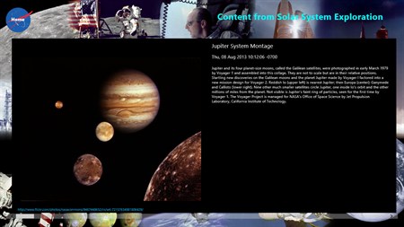 NASA Historic Photos displays images and descriptive information from NASA on the Commons Flickr Albums. There are 60 galleries. Use touch or your mouse to scroll the gallery and then tap/select the gallery you wish to view. Each individual gallery is scrollable and content will "snap" into place as you scroll with touch or mouse.