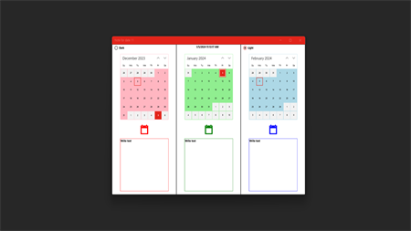 Click calendar items! Write, store and see notes with the past, this, next month calendars. These notes are stored in your local storage using SQLite database.
