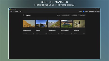 + Quickly view ORF . + Manage your ORF library. ++ Open file with default app. ++ Reveal file in File Explorer. + Save file to PNG, JPG, BMP with resize option.