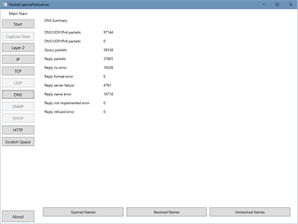 This program processes network packet capture files (pcap) you created by running a network packet capture program (e.g. wireshark, tcpdump) and extracts statistics. Process: 1. You choose one or more capture files. 2. You start the processing. 3. The program does the processing which can take a while, depending on the number and sizes of the input files. You can expect a processing speed of up to 100 MB/s, depending on the mass storage the input files are stored at. 4. You can browse the various statistical numbers in the UI and export some of them in CSV format to the clipboard for further processing (e.g. paste into Excel). Supports packet capture files in classic (pcap) and new (pcapng) file formats. The current version supports the following statistical numbers: - Layer 2 - General Ethernet Statistics - MAC/Ethernet Addresses: - Source addresses, Destination addresses, Multi-/Broadcast addresses - Ethernet frame size histogram - Linux Cooked Mode Statistics - Linux Cooked Mode frame size histogram - ARP: Packet counts - ARP: Extracted address mappings - PPPoE - PPPoE Discovery - General Stats - Access Concentrators List - List of Established PPPoE sessions - PPPoE Session - General Stats - LCP Stats - PAP Stats - IPv4: General Statistics - IPv4/IPv6: Address lists - Source addresses, Dest addresses, Source only addresses, Dest only addresses - each address with timestamps: first seen, last seen - lists can be filtered by address ranges (not yet for IPv6) - TCP: - Source and Dest ports used - DNS: - General Statistics - Queried Names (A record: IPv4) - Resolved Names (A record: IPv4) - Unresolved Names (A record) - Record Type counters - LOC records - DHCP: - Client MAC addresses - Host names - established DHCP configurations - TFTP - General Stats - File Transfers - HTTP (not HTTPS) - Request Targets (URLs) - Request User Agents - Response Status Codes - Server Software (extracted from Responses) - Content Types