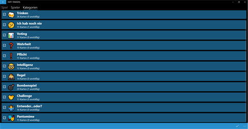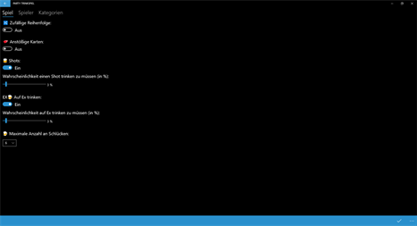 Bring mit dieser App Schwung in die Party: Versammelt euch im Kreis, jeder mit einem Getränk (vorzugsweise alkoholhaltig) vor sich. Diese App zeigt nun nacheinander eine von über dreihundert lustigen Karten aus verschiedensten Kategorien an. Darunter sind Minispiele, Regeln, pikante Fragen und natürlich Trinkaufforderungen. Ihr könnt selber festlegen mit welchen Kategorien ihr spielen wollt. Viel Spaß!