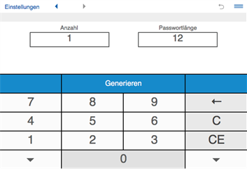 Erstellen sicherer Kennwörter: um ein Passwort zu generieren, legen Sie die Passwortlänge und die Zeichenkombination fest (Großbuchstaben, Kleinbuchstaben, Ziffern und Sonderzeichen) und drücken Sie die Schaltfläche 'Generieren'.