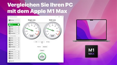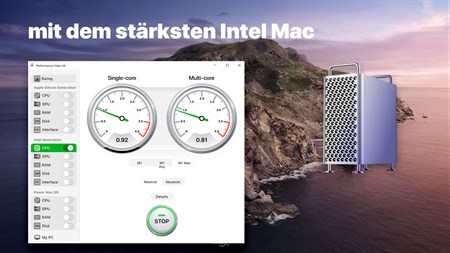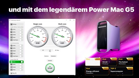 In unserer App können Sie die Leistung Ihres PCs mit dem Power Mac G5 und Computern der Apple Intel Generation vergleichen.