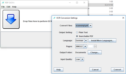 A simple drag-and-drop utility for Mac OS X and Windows, that converts images and single-page PDFs into text documents or searchable PDF files. It uses advanced OCR (optical character recognition) technology to extract the text of the first page of PDF even if that text is contained in an image. This is particularly useful for dealing with PDFs that were created via a Scan-to-PDF function in a scanner or photo copier.