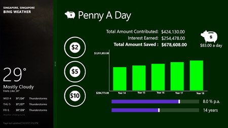 An app that calculates and display the amount of money you could potentially save using time value of money via easy-to-read charts. Simply set the number of years you wish to save for, enter a daily saved amount and intended rate of interest and you're all set! Users can also save the adjusted settings to a CSV file and/or share it with their friends.