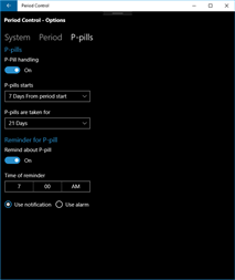 Reminder before your period: The system can remind you of your next period. You can set how many days before and at which time of the day you want the reminder. P-pill reminder: The system can remind you to take your p-pill every day in the period where you are supposed to take it. You can decide at which time of the day to get the reminder.