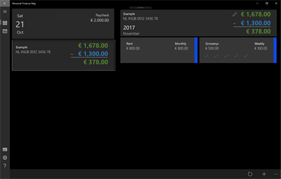 This app is focused on predicting upcoming expenses. When you create a new account you can specify expenses and incomes. When a new month is created (book month) the app will use your defined expenses to determine if they need to be paid in the next month. If so they will be added. The app supports different expense occurance types. Weekly expenses (for example grosseries), monthly expenses (like rent), quaterly expenses (once per 3 months) and annual expenses (yearly). Once a book month has been created for the next month, that month is usable as a account ledger. You can swipe to mark an expense paid and by doing so create a overview of remaining expenses that month that can easily be used to keep track of your account balances. In the book years view you build a history of expenses for your accounts. This history provides the ledger of the application. When you update the expenses in the account definition you can update the current month with these expenses from the current month view.