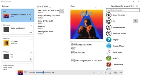 Features: Abspielkontrolle (Play/Pause/Next/Previous), “touch” optimiert Gruppen Lautstärke/Stummstellung, individuelle Lautsprecher Lautstärke/Stummstellung Musikauswahl von allen Quellen, einschließlich der Musikbibliothek und aller Musikdienste (einschließlich Spotify, Pandora, Napster und Apple Music) Gruppenkonfiguration: einfaches Hinzufügen und Löschen von Lautsprechern Suchen in der Musikbibliothek, Musikdiensten, und Radio Stationen Einfache Konfiguration von Schlummerfunktion und Alarm Lautsprecherspezifische Optionen für Nacht-Modus und Sprachverbesserung Auflistung und einfache Änderungen der „Queue“ Benutzeroberfläche mit heller/dunkler Einstellung Equalizer Einstellungen Sichern der „Queue“ als Playlist Like/Dislike auf Pandora