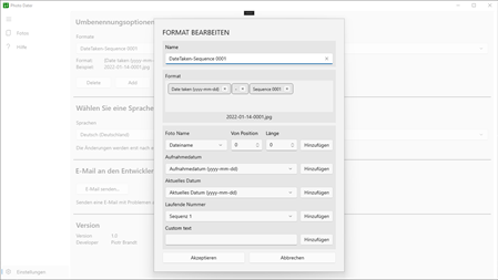 'Photo Dater' ist ein Tool für Foto-Enthusiasten, mit dem man das Aufnahmedatum und den Dateinamen eines Fotos ändern kann. Mit Hilfe des Tools ist es einfach, unterschiedliche Aufnahmedaten und Dateinamen für mehrere Fotos gleichzeitig zu erstellen.