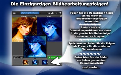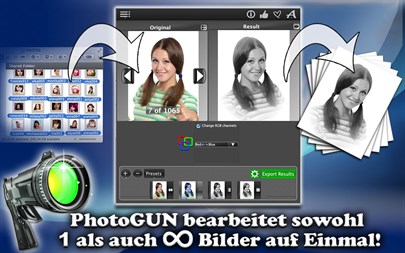 Man verliert eine Menge Zeit für die Bearbeitung, Umbenennung und Umwandlung von Bildern, denn diese Operationen für jedes einzelne Bild von Hand gemacht werden. Aber keine Sorge denn es gibt jetzt eine perfekte Lösung! PhotoGunLite erledigt diese, mühsame Stunden Arbeit, für Sie und reduziert sie in ein paar einfachen Klicks. Sie werden in der Lage sein: - Die Profi-Effekte einzufügen, wie zum Beispiel "Vignettierung", um eine kreative Wirkung von Ihren Werken zu steigern und noch mehr Aufmerksamkeit auf Ihre Bilder zu wecken; - Die Bilder vertikal und horizontal zu spiegeln; - RGB-Kanäle umzutauschen; - Die Bilder in Graustufendarstellung zu konvertieren; - Die Reihenfolge von der Operationen zu ändern um die besten Ergebnisse zu erzielen; - Die Opeationsfolgen als Voreinstellungen zu speichern, und wann immer Sie diese wieder brauchen öffnen; - Zwischenergebnisse von jedem gemachten Operationsschritt mit Retina-Unterstützung anzusehen (drucken Sie auf das Auge-Symbol vom Bild-Thumbnail); - Die neuen Namen Ihren Bildern zu vergeben; - Die Bilder in alle wichtigen Dateiformate zu konvertieren wie z.B.: a) JPEG: mit dem gesamten Umfang der Qualitätskomprimierung von 1% bis 100%; b) PNG; c) BMP; d) TIFF; e) XMP; f) PPM.