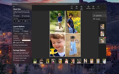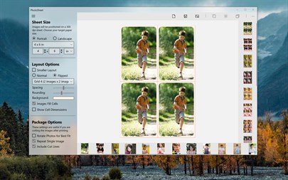 Easy to use • PhotoSheet Imperial and Metric paper sizes! All of the A's and B's and P's are there for your choosing! If your favorite paper size is not in the list, don't dismay: you can enter any sheet size you like, in inches or centimeters! • PhotoSheet remembers your settings from one session to the next! If you frequently use the same layout or sheet size, you'll love this. • The film strip holds all of the photos you're working with, and page views help you build multiple pages using the same layout! Create package prints for several photos at once! • Choose a different layout and automatically fill the open spaces with unused photos, or gather images together to use fewer pages! • "Remove" buttons on filmstrip items, pages, and layout cells make adjustments easy when you change your mind! • Images can be repositioned and resized inside their layout cells - Select the image first, then drag the image or roll your mouse wheel to zoom. If you have a touch screen, pinch or use two fingers to move or zoom the image.