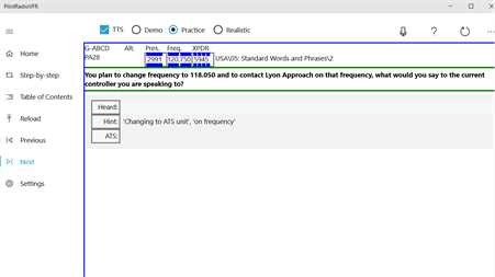 This application uses speech recognition and speech synthesis to simulate radio communication between a light aircraft pilot under Visual Flight Rules (VFR) and Air Traffic Services (ATS). It listens to your spoken requests and responds appropriately. It goes from an introduction to the phonetic alphabet all the way to complex interactions requesting traffic services etc. It has Demonstration, Practice and Realistic modes that guide you through what to say and then challenges you to try it for yourself in a realistic way. It is inspired by international aviation standards, with options to use USA, UK or ICAO style phraseology where they differ. It is made up of a collection of Scenarios that provide Overview information, demonstration and practice Interactions for various typical Situations. A Scenario would be something like ‘Position Reporting’ and there may be several different Situations with varying details as examples of that Scenario, so your location, time, level, destination etc. would vary, and these are chosen appropriately but randomly by the computer.