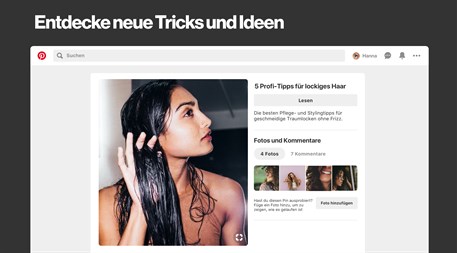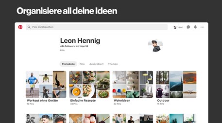 Pinterest ist eine App zum visuellen Entdecken von Ideen für deine kleinen und großen Projekte. Hier kannst du die besten Ideen aus dem gesamten Web erkunden, von deutschsprachigen aber auch von internationalen Seiten. Jeden Monat kommen weltweit 200 Millionen Nutzer zu Pinterest, um die Dinge zu entdecken und zu tun, die sie lieben.