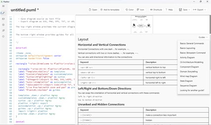 GUIDES • Access PlantUML guides for all diagram types right next to your editor window. These guides offer quick look-ups and overviews of diagram-specific commands.