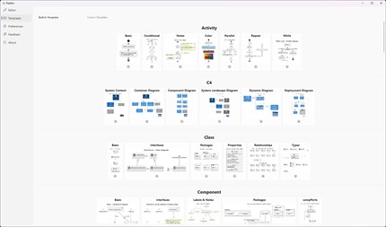 TEMPLATES • Explore a vast range of templates for all diagram types in our built-in gallery. • From C4 Architecture modeling to network diagrams, we've got you covered. • Create and save your diagrams as custom templates for future use.