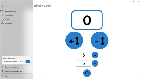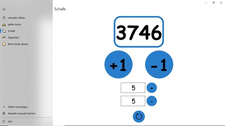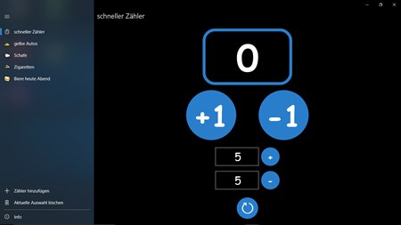 Diese App ist ein einfacher Handzähler. Mit ihr können sie alle möglichen Sachen zählen. Sind es so viele zu zählenden Dinge, dass sie mit 1er Schritten nicht mehr weiter kommen, dann geben sie einfach die erwünschte Zahl ein die addiert werden soll. Des weiteren unterstützt diese App den Compact-Overlay Modus, das heißt: Das App-Fenster ist auf Wunsch ständig im Minimodus im Vordergrund sodass Sie einfach aus Dokumenten usw. zählen können. Wenn Sie fürs erste fertig gezählt haben, dann können sie auf Wunsch den aktuellen Stand speichern und später weiter zählen.