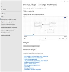 Aplikacija "Programski jezik C++" predstavlja digitalni kurs sa video-materijalima i primjerima koda koji ilustruju način funkcionisanja programskog jezika C++. Namjena ovog digitalnog kursa je savladavanje programskog jezika C++ i osnovnih principa objektno-orijentisanog programiranja. Nakon usvajanja materijala prezentovanih u kursu "Programski jezik C++", student je osposobljen da implementira kompleksna rješenja korištenjem programskog jezika C++, te da raspolaže znanjima neophodnim za upotrebu standardne biblioteke ovog jezika uz pridržavanje konvencija specifičnih za ovaj jezik. Student razumije objektno-orijentisanu paradigmu i ispravno primjenjuje principe objektno-orijentisanog programiranja, uključujući enkapsulaciju, skrivanje informacija, te upotrebljava mehanizam polimorfizma i pridržava se osnovnih principa programiranja, sa ciljem maksimiziranja čitljivosti i eliminacije dupliranja koda. Kurs se sastoji od video-materijala u kojima se izlaže relevantna teorijska osnova. Svako poglavlje kursa sadrži video-materijal sa teorijskim izlaganjem i obrazloženjem praktičnog primjera. Uz video-materijale, u svakom poglavlju dostupni su primjeri koda koji ilustruju principe iznesene u teoretskom izlaganju. Svako poglavlje, pored ovih materijala, sadrži i veze ka eksternim web prezentacijama koje obrađuju tematiku poglavlja, kao dodatnu literaturu.