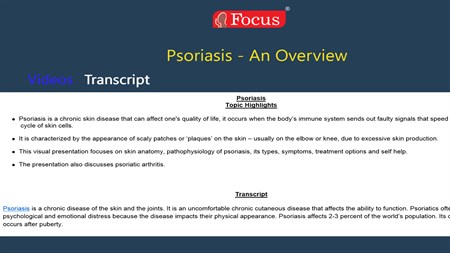 This animation focuses on psoriasis, describing the skin anatomy and pathophysiology of the disease. It also discusses in detail the types of psoriasis, treatment options and self help guidelines.
