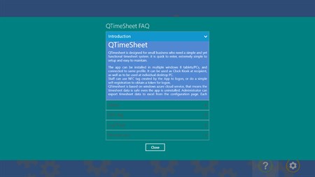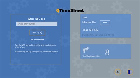 QTimesheet is designed for small business who need a simple and yet functional timesheet system. it is quick to enter, extremely simple to setup and easy to maintain. The app can be installed in multiple windows 8 tablets/PCs, and connected to same profile. It can be used as clock Kiosk at recipient desk, or used as tablet app for mobile workers, as well as to be used at individual desktop PC. Staff can use NFC tag created by the App to logon, or do a simple self-registration to obtain a token for logon. QTimesheet is based on windows azure cloud service, it means the timesheet data is safe even the app is uninstalled. Administrator can export timesheet data to excel from the configuration page. Each staff can export their own timesheet data to excel as well.