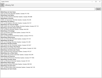 Quebec Libraries is an application with the list of public libraries in the province of Quebec, Canada. You can search in this list of libraries. The libraries are also shown on the map. Each library has the following information displayed on the library details page: Name, Address, Phone, Website, Catalog URI, Coordinates, Abbreviation, Type, Region, Telecopier. You can copy any of these fields to the clipboard.