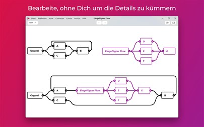 BEARBEITE, OHNE DICH UM DIE DETAILS ZU KÜMMERN Das Layout passt sich automatisch an, egal, was Du veränderst. Füge einen ganzen Unter-Flow in die Mitte des Flows ein. Lösche einen beliebigen Teil des Flows, egal wie vernetzt er ist. Du wirst nicht den größten Teil deiner Zeit mit dem Beheben von Layout-Problemen verbringen müssen.