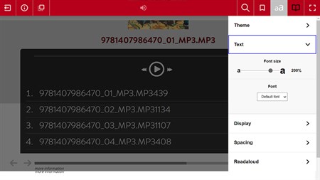 EBOOK READER • Bookmarking opens the book across multiple devices • Font-size and font face changes, as well as dyslexic-friendly font • Background color changes • Full text search