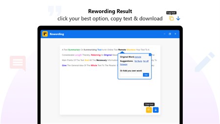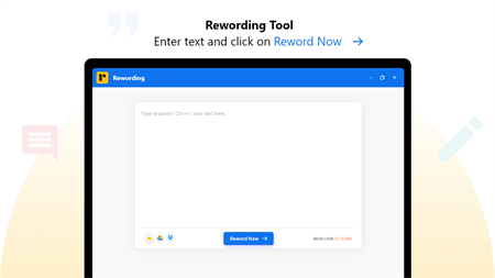 You can use our rewording tool to quickly reword your content. This tool comes with a lot of useful features and it can be used instantly. With this tool, uploading, rewording, and saving your work is super easy. The simple interface can be used and navigated by everyone without any hassle. You can use this tool to make your content unique and more engaging before publishing it online. How to Use This Rewording App? Here are the steps that you need to follow to use this tool: Type or copy-paste your content inside the input box. Alternatively, you can upload a file from the system storage. Click the ‘Reword Now’ button. Edit and save the results. Why You Should Reword Text Using This Tool? There are a lot of different advantages that you can get when using this tool for rewording sentences. Some of them are: 1. Editable Results Once the tool provides the reworded text, you can click on the changed words to see other suggestions that can be applied in their place. You can also add your own words by typing them out in the output box. In this way, you can change the results according to your particular need and requirement. 2. Color-Coded Changes for Easy Visualization The changes made by our rewording app are all highlighted in different colors so that you can easily spot them. 3. Easily Copy and Download Results After you’ve finalized the output, you can click on the ‘copy’ icon to instantly copy it to your clipboard. Or, if you want to save it for later use, you can click on the ‘download’ icon to download the file to your system. 4. 2,000 Word Limit With this rewording tool app for Windows, you can reword whole articles and blog posts in one go without worrying about the word count. You can enter up to 2,000 words in a single attempt. 5. ‘History’ Feature for Old Documents If you ever want to retrieve a document that you reworded previously, you can find it under the ‘History’ tab on the home screen. In this section, you can find the files that you worked on earlier. You can also delete them if you want.