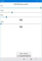 When used on desktop, with Windows version 16299+, app can be called from command line. Syntax: RGBbulb BTADDR WHITE or RGBbulb BTADDR RED GREEN BLUE Where BTADDR is MAC address of bulb, WHITE, RED, GREEN, BLUE - appropriate values (0-255) to be set. E.g. RGBbulb F8:1D:78:60:36:C2 26