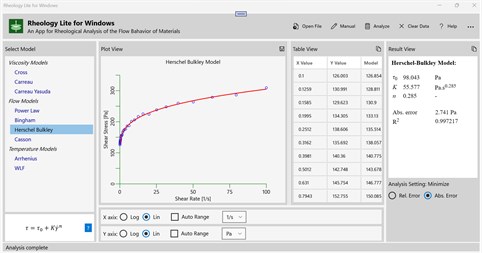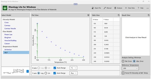 An App for Rheological analysis of the flow behavior of non-Newtonian materials. Determine the zero-shear-viscosity, shear-thinning-index, relaxation time, yield stress, flow activation energy, and WLF parameters.