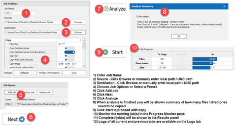 Allows you to easily add multiple RoboCopy jobs to a queue, choose RoboCopy settings, or select preset settings, run an analysis to see what files / folders need copying and then monitor the job(s) live as they run using the Job Monitor.