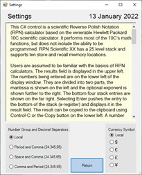 This is the latest version of the RPN Scientific series. It has a 25 level stack and supports ten store and recall memory locations. It now has a "Last X" button, as well as "Clear", and "Copy" buttons. It now supports engineering format, in addition to fixed, scientific, general, and currency formats. It has a fixed screen size of 460x587 pixels.