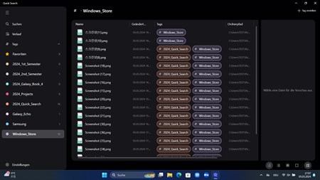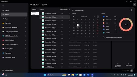 Mit der Schnellsuche kannst du in Dateien suchen, nicht nur nach Dateinamen. Du kannst Text in Dokumenten, Tabellen und Bildern finden, sogar wenn es Tippfehler gibt. Außerdem kannst du nach dem Datum suchen, an dem die Datei geöffnet wurde, und Tags zu deinen Dateien hinzufügen, damit du sie leichter finden kannst.