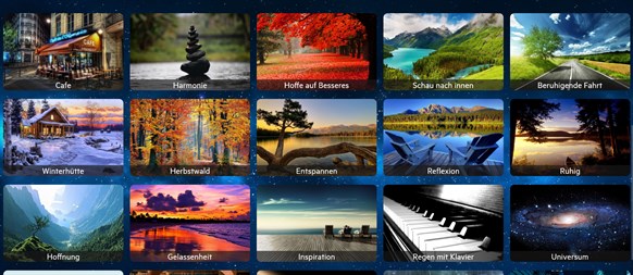 ★ Ozean ★ Wald ★ Regen ★ Nacht ★ See ★ Bach ★ Grünland ★ Höhle ★ Bauernhof ★ Lagerfeuer ★ Wasserfall ★ Unterwasser ★ Wüste ★ Zugfahrt ★ Flugreisen ★ Café ★ Harmonie ★ Hoffe auf Besseres ★ Schau nach innen ★ Beruhigende Fahrt ★ Winterhütte ★ Herbstwald ★ Entspannen ★ Ruhe ★ Hoffnung ★ Gelassenheit ★ Inspiration ★ Regen mit Klavier ★ Universum ★ Tiefes Denken ★ Bibliothek ★ Fokus ★ Regnerisches Wochenende ★ Meditiere im Wald ★ Stadtleben