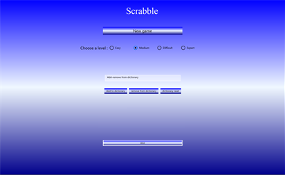 Jeu de scrabble en français, jouez contre votre tablette, smartphone ou pc et essayez de gagner la partie en glissant vos lettres sur la grille afin de placer judicieusement vos mots vous pouvez choisir le niveau de difficulté. Dictionnaire officiel du scrabble. 102 lettres dont 2 jokers, fonction rappel des lettres, échange, passe, permutation sur le chevalet pour une meilleure recherche de mot, zoom réglable et possibilité d ajouter ou retirer des mots du dictionnaire enregistrement des meilleurs score. Aucune publicité