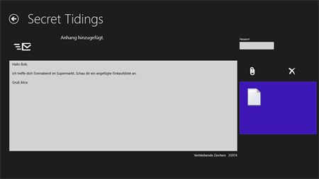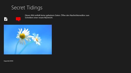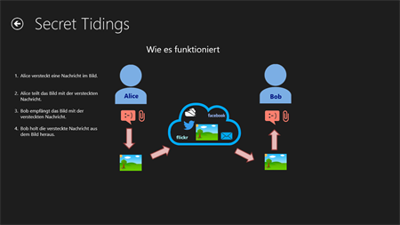Diese Anwendung versteckt Nachrichten in Bildern. The Bilder können dann per Email, Cloud oder Sozial Media geteilt werden. Nur Eingeweihte sind in der Lage die Nachrichten zu lesen. Secret Tidings nutzt Steganographie, auch bekannt als die Kunst etwas zu verstecken. Verschlüsselte Nachrichten locken die Aufmerksamkeit von nicht authorisierten Angreifern auf sich. Die Kommunikation über eine unverdächtige Schicht fügt der Konversation eine weitere Stufe der Sicherheit hinzu. Secret Tidings ermöglicht es Nachrichten zu verfassen, beliebige Dateien an die Nachricht anzuhängen und beides in einem Bild zu verstecken. Die versteckten Nachrichten sind passwordgeschützt. Anhänge und Nachrichten können vom Empfänger wieder aus dem Bild hergestellt werden.