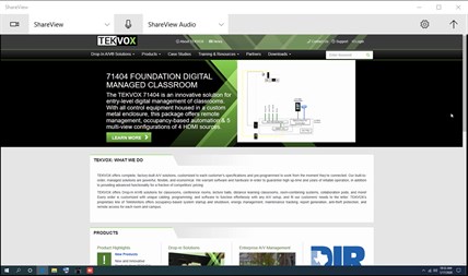 TEKVOX's ShareView™ technology allows meeting participants to directly share content from their laptops in a web-based video conference by adding a real-time HDMI channel into the conference PC. Sharing content in a typical PC-based conference room requires that the content owner either transfer the content to the conference PC or connect their laptop to the cloud meeting in parallel with the conference PC. Moving presenter content to the host PC whether by USB drive or file sharing carries pervasive security issues while connecting in parallel to the cloud from the meeting room wastes time, increases cost and can create a myriad of frustrating audio feedback issues that can be tedious to eliminate.