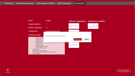 This application was developed at the Budapest University of Technology and Economics, Department of Automation and Applied Informatics. Its purpose is to demonstrate the progress of our signature verification research and to allow local testing of different configurations. It comes with a set of built in signature samples, but you can also use it to verify the authenticity of your own signatures. Please, contact us if you plan to use it for any business purposes.