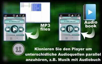 Der Player zeigt den Titel der Audiospur an, die gerade gespielt wird und zeigt Ihnen Ihre Spielliste. Neue Dateien können jede Zeit hingefügt werden. Man kann ausserdem den Player klonen und eine ganz neue Spielliste für den Player Nr.2 erstellen. Die zwei Player können entweder separat oder zusammen benutzt werden.