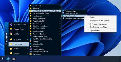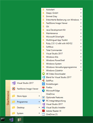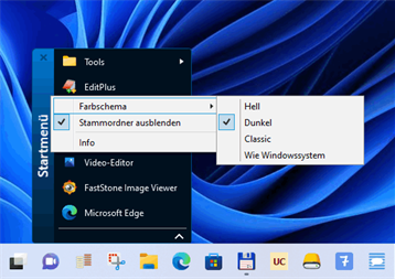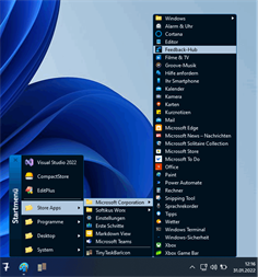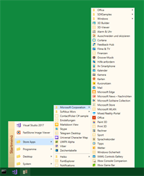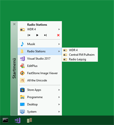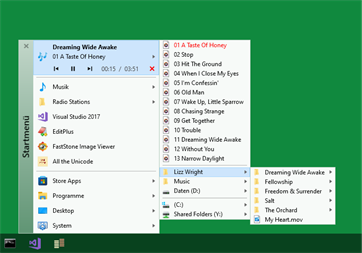 Die App Startmenü gibt Ihnen einen Überblick Ihrer Store-Apps, Destop-Anwendungen, Desktop-Links und diverser System-Anwendungen. In einer kompakten Menüstruktur, ähnlich der Startmenüs früherer Windows-Versionen, können Sie Ihre Programme auswählen. Zur optimalen Nutzung wird empfohlen, die Startmenü-App an geeigneter Position in der Taskleiste zu platzieren. Mit dem eingebauten Audio-Player können Sie Ihre Musikdateien, Playlists und Radio-Streams abspielen.