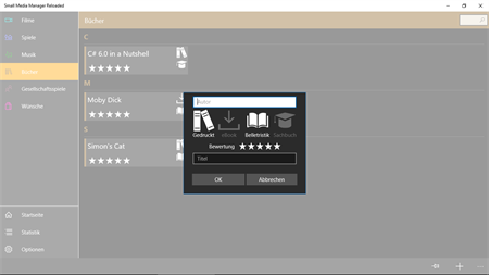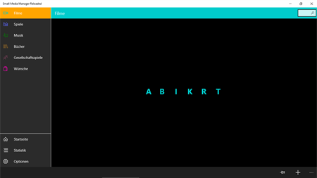Mit dem brandneuen Small Media Manager Reloaded kannst du Informationen zu deinen Filmen, Spielen, Musikalben, Büchern, Geselschaftsspielen, Software und Wünschen speichern. Dies ist eine simple App um einen Überblick zu behalten. Schnell und einfach, ohne Schnickschnack.