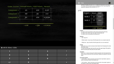 The best thing about Smartboard Calculator is how it outperforms any regular calculator in every area. Thanks to its export to Excel™ function (works best with grids), Smartboard Calculator can also be the birth place of every homework. Plus, no calculation you write is ever lost – with the app’s history log you can refer back to any expression you wrote earlier. To be sure you never lose this data, you can also backup all your app history to SkyDrive and restore it if you need to.
