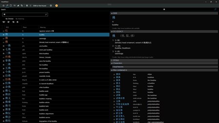 It includes standard dictionaries for English, French and German, as well as specialized dictionaries: DDB (Digital Dictionary of Buddhism, short definitions) and CJKV-E (CJKV-English Dictionary of Confucian, Daoist and Intellectual Historical Terms, short definitions).