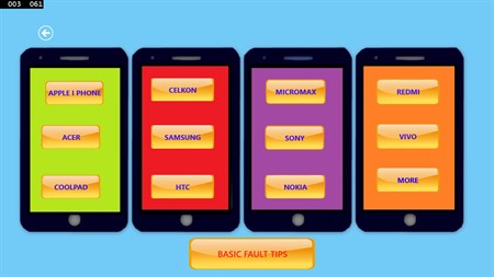 first image is a home screen . second screen for the second image and the last image for fault solving steps. this app for using for the basic smartphones problems can be solved. that is use for save for the time.
