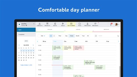 ✓ corporate messenger, mit dem Sie mit Mitarbeitern und externen Partnern kommunizieren können; ✓ visual storage for contacts, divided into groups and by priorities; ✓ Projekte mit beliebigem Verschachtelungsgrad; ✓ individuelle und Teamziele; ✓ einfache Genehmigung von Dokumenten (Dienstschreiben); ✓ Flexible Zugangsrechte, Zeiterfassung und vieles mehr.